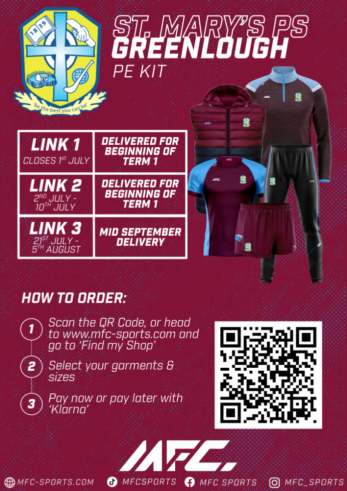 PE uniform's are available through MFC . Parents can simply click on the link below to order and all items will be delivered to school free of charge. It is NOT COMPULSARY for children to wear a PE uniform at this time. Our normal full school uniform is expected to be worn throughout the week and our PE uniform can ONLY be worn to school on: